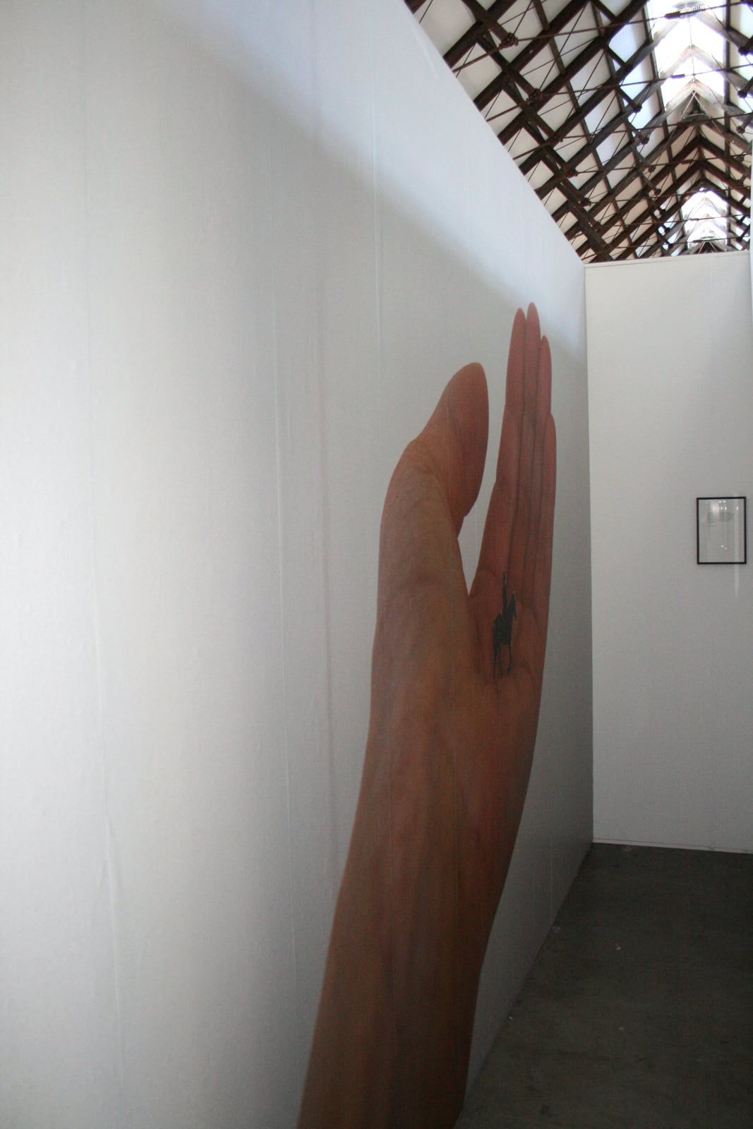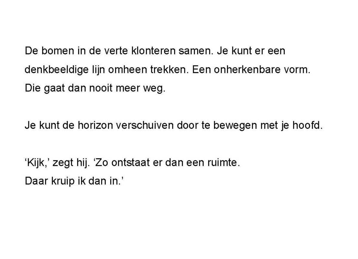 Installatie bestaande uit foto (3 x 4,5 meter) gecombineerd met 5 tekstfragmenten in een expositieruimte (3 x 0,8 x 4,5 =lengte x breedte x diepte)